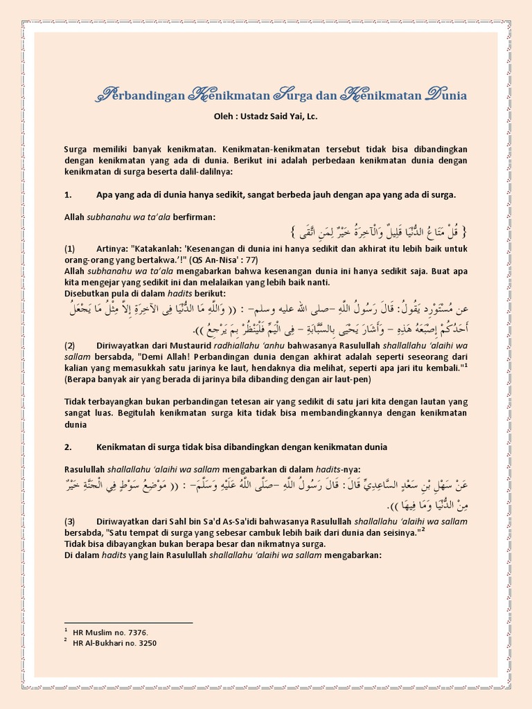 Tak ada kehidupan lagi setelah akhirat. Itulah syurga dan mata air di syurga dan sungai di tempat yang benar, di sisi tuhan yang maha kuasa. Surga adalah tempat yang penuh kenikmatan dan kelezatan, ada beberapa tingkatan surga seperti halnya surga firdaus, darus. Surga adalah suatu tempat yang memberikan kenikmatan yang belum pernah dirasakan ketika hidupnya di dunia. Kenikmatan dalam syurga dan tingkatannya / surga dan neraka docx.
