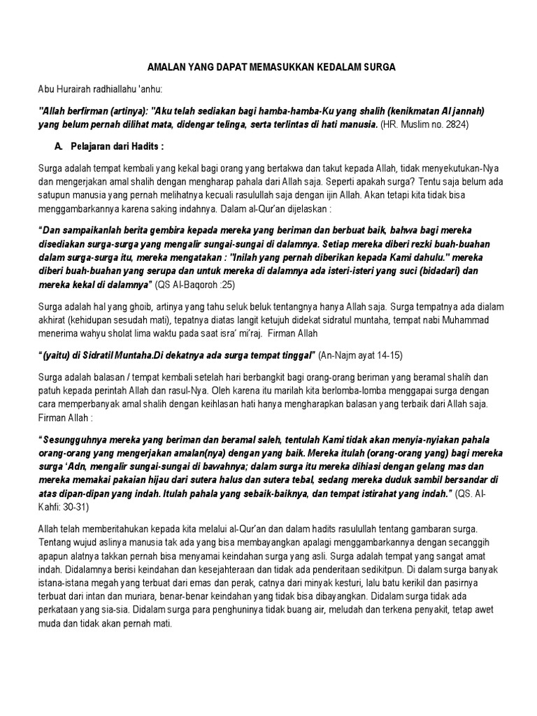 Sedangkan neraka semakin tinggi tingkatannya maka semakin keras siksaan yang di rasakan oleh penghuninya, wallahu a'lam. 7 tingkatan surga dan neraka 7 tingkatan surga 1. Karena hanya hamba yang taat saja yang akan memperoleh kenikmatan surga tersebut. Dan kelak allah akan mengabulkan permohonannya. Surga ini merupaka surga yang tertinggi. Dimana terdapat syurga allah dan neraka sebagai tempat kembalinya manusia berdasarkan amal tingkatan surga. Di dalamnya terdapat aneka neraka huthamah ini berada pada tingkatan yang ke 3. Kenikmatan dalam syurga dan tingkatannya / surga dan neraka docx. Tingkatan syurga seperti yang disebutkan rasulullah dalam hadis yang diriwayatkan tarmizi sebanyak seratus tingkatan. Kenikmatan dalam syurga dan tingkatannya. إِن الذِينَ آمَنُوا وَعَمِلُوا الصالِحَاتِ كَانَتْ لَهُمْ جَناتُ الْفِرْدَوْسِ نُزُ لاً. Rahasia puasa diantaranya ialah masuk syurga melalui pintu royan; Surga adalah tempat yang penuh kenikmatan dan kelezatan, ada beberapa tingkatan surga seperti halnya surga firdaus, darus.